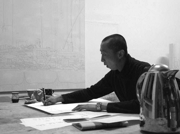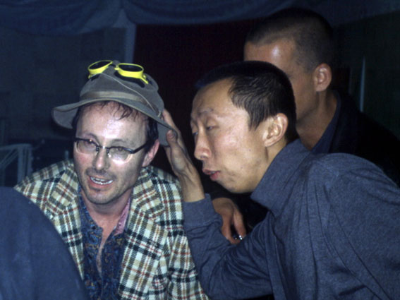 Fei Teng in seinem Atlelier, Domagk Raum 102, 2000 FEI TENG Eines Abends. Lernte ich auf einer, der damals schon unzähligen Partys im damals noch ununterteilten und damit ein geilen Veranstaltungsraum des ehemaligen Salons für Offiziere, Party im Haus 16, Fei T., und damals noch seine Freundin Hau Chun K. kennen. Fei lag am Boden. Hau Chun saß auf ihm drauf. Sie saß auf Fei, so vertraut, wie ein kleiner Affe, ein Äffchen das gerade seinen Artgenossen laust. Über allem, und das ist jetzt unsere, die der Künstler-Geschichte, und fast hinter jedem Vorgang, jeder kulturellen Organisation schwebte als Antrieb Fei Teng, der freie Geist aus China: Teng Fei - Fei Teng, der die Freundschaft mit Elmar H.- Guantes und mir, und mit ihr seine geistige Schwangerschaft und geistliche Niederkunft in Christian Blödgott fand. china, Fei T. war Schmetterling, war hier wie dort, war mit jedem befreundet, hatte die Größe jedem seine Würde zu lassen, in seinem Atelier gingen die abgestürtzesten Existenzen aus und ein, Fei hatte Vertrauen zu allen, ja nicht einmal das, Fei Teng hatte keinen Gedanken daran irgendjemand zu mißtrauen, und so spielten sie die Rollen die sie waren, jeder nahm in Feis Gesellschaft, dem ihn zustehenden Platz ein, ganz unkompliziert, Platz war ausreichend vorhanden und Fei's Bedürfnis waren die Menschen in allen Facetten, er hatte Hunger nach Kultur.