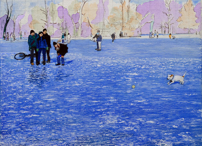Kleinhesseloher See, Studie für Malerei: ÜBER WASSER LACHEN, 23.4.25, 40x30cm, Vinyl auf Leinwand, 2. Zustand