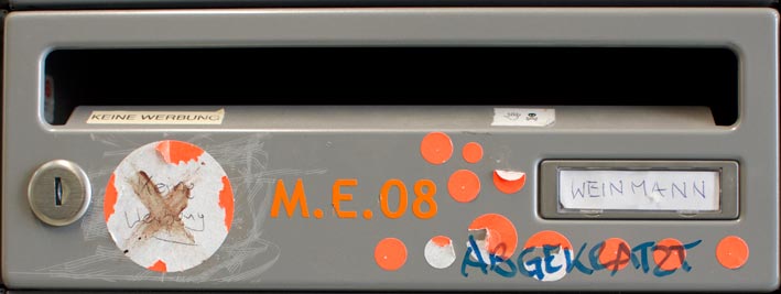 | Ein Kreuz aus Karnickelblut. Etiketten in dreifacher Größe, ein Namensschild, Schloß, Gekratze mit Messer, Spucke, Schriftzug:"ABGEKRATZT", Schriftzug:"M.E.08", 2 Aufkleber, im Kasten: ein verschimmelter Pfirsich vom Bocksbein, diverse Post und Bildzeitung, manchmal vollgestopft bis obenhin. |