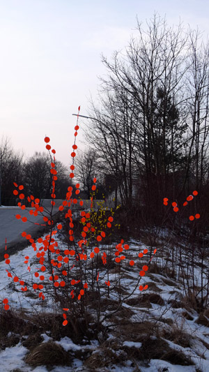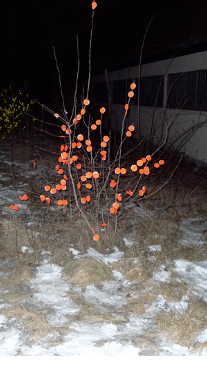 die Klebeetiketten-Punkte so an den Ast klebte, dass der