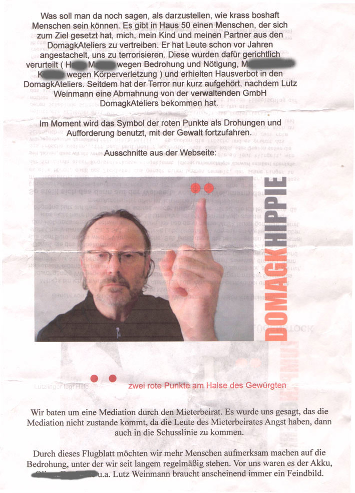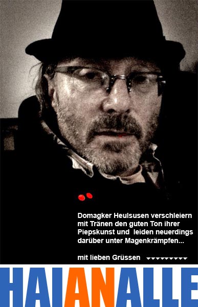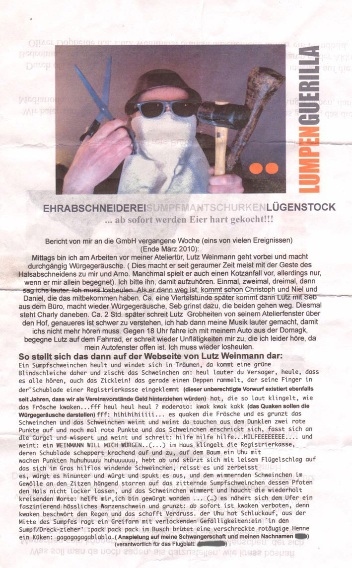selbstportrait als wischmobb "deis hätteschtdu sehe solle, die rode war ein ainziger roder flegg, die hat geschrieä sagi dir, wie oi Furie, hat an der türe vom auto gezogen und gerüttelt und wollte die XXX rausziehe, du kannsch dir des ganet vorschtelle, du woischja, die rode, die isch koi kloine... desch wara bild unglaublich, fascht a kunschtwerk midde uschi auf de kühlahaube..." |