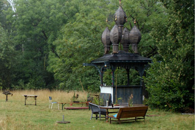 Eines Tages brachte der 'der Gelockte, mit dem gleissenden turbogebildeten Überblick', eine Fuhre Holz mit, die meinte er, könne man hier gut aufstellen, ein eine Art russische Kathedrale mit norwegisch inspiriertem nordamerikanisch ornamentierten Unterbau einem Stück schönsten Kitschs, das entweder eingelagert werden soll, oder aber stehen kann, ob wir das wollen?