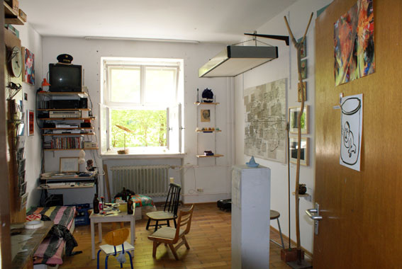 5. Szene, Wand fährt wieder hoch, Atelier lutzili Domagktage, Türe auf, im Gang Babygeweins, Russin: " ... muss rraus aus Haus, oda mächst du härrn den ganzen Tag Bäbigeschrai?"