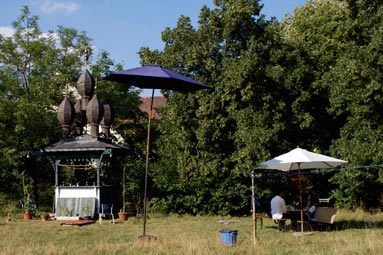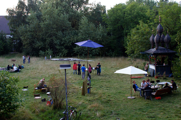 Freilich wollten wir und bauten und stemmten uns saufend der bedenkenden skeptischen Befürchtung entgegen, dass "sich da jetzt Gschwerl versammelt", dass da jetzt bestimmt schon gleich als erstes 'die Kleine mit ihrer Begleitung' einer Flasche helles Augustinerbier, die den Fleck schon gleich sofort mit ihren Pflanzenkübeln besetzte und mit als erstes mit ihren frischen Geschichten die ersten 3 Tage und Nächte den neugeschaffenen Ort huldigte, und alle hatten Spass am Fleck, und bestätigten dem ängstlichen Blick seine Zweifel schon gleich und fortwährend am Nachmittag, hockten sie draussen und tranken Kaffe und Bier und repetitierten dumpfplumpen wummernd pumpenden Techno durch die Nacht und die Mädels kamen und lachten laut und der Ball flog und der 'Cowboy from irgentwoher' legte lässig-lässig seine Plastikschuhe auf den Tisch, ein dicker Hintern schmeisst Steckchen durch die Luft, und bellende Hunde streunen und kakken auf der Wiese neben aufgeblähten Ratten die vergiftet liegen und fette Fliegen surren grün metallisch in ihrem Glanz die Sonne blinkend widerspiegelnd durch das spätsommerlich weissblau bewölkte Licht, Elstern schnattern, Krähen krähen, Amseln flattern und im Schatten des Turms sitzt an einer modrigen Bierbank der Giftzwerg, leckt an seiner Brause und zeichnet und liest und freut sich am Anblick der wildgewachsenen Büsche, und kein krankes Kaninchen hoppelt hinkend erblindend durch die friedliche Idylle auf der Suche nach einem Platz zum Verenden....